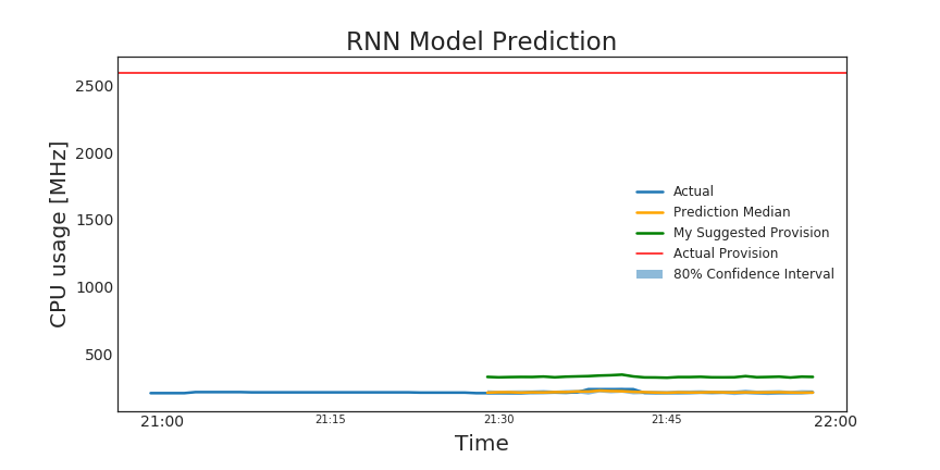 Figure 5. RNN model predictions (orange), my suggested provision (in green). While this might seem like my suggestion is high, in the context of what was originally provisioned (shown in red in second figure), we can see that my model significantly reduces over-provisioning and saves CPU.