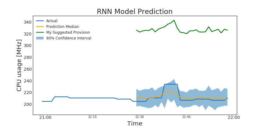 Figure 5. shows an example of the DeepAR model’s predictions for one time series (one VM). The model appears to be very accurate based on our visual exploration of the predictions. However, notice how my model (in orange) slightly underestimates the actual usage (the blue line). Therefore, in consultation with Manifold, I decided that they should take the upper bound of the forecast and add a cushion (e.g., 100 MHz) to reduce incidents of under-provisioning (shown in green). My Suggested Provision = Upper Limit + 100 CPU [MHz] cushion.