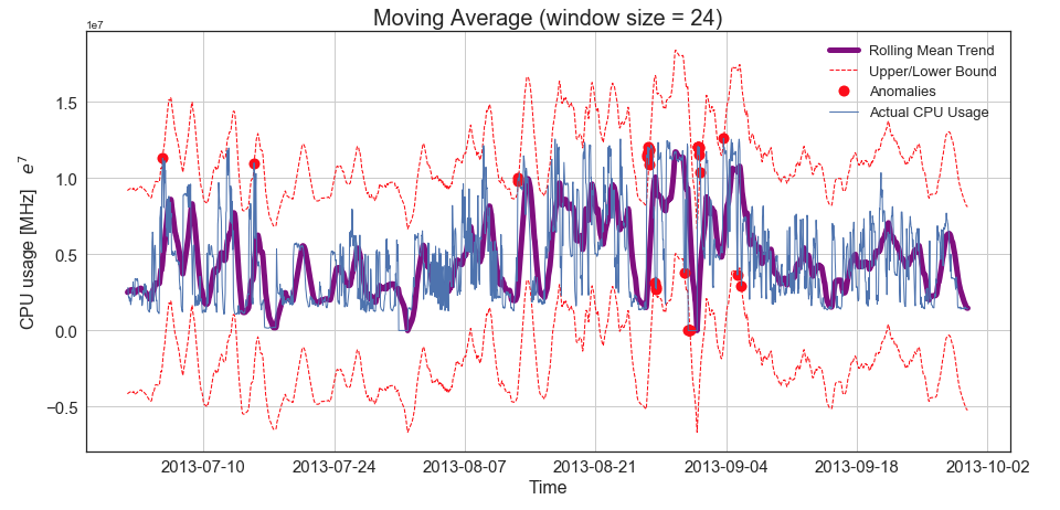 Figure 2. Moving averages in hourly data to capture higher level trends. Anomalies and confidence bounds shown red in second image (swipe to see).