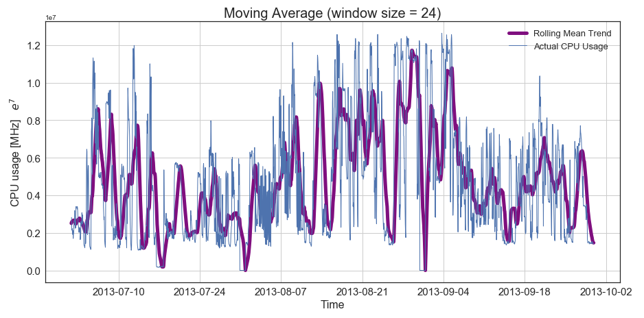 Next, I wanted to get a sense of the seasonal trends in CPU usage across the three-month time span. To do this, I used moving averages with a 24-hour window (to capture the seasonality of this hourly data). I used this technique to get a sense of higher level trends in data over time, as well as spot any potential outliers. We can see this in Figure 2. that there is short-term seasonality (or trends) within the data as indicated by the purple line, but the patterns change over the long term, especially across months. This method has also caught some anomalies in the data flagged with red dots. While removing outliers would make modeling easier and perhaps more accurate, the nature of network usage is unpredictable, and therefore my model needed to be able to handle anomalous activity.